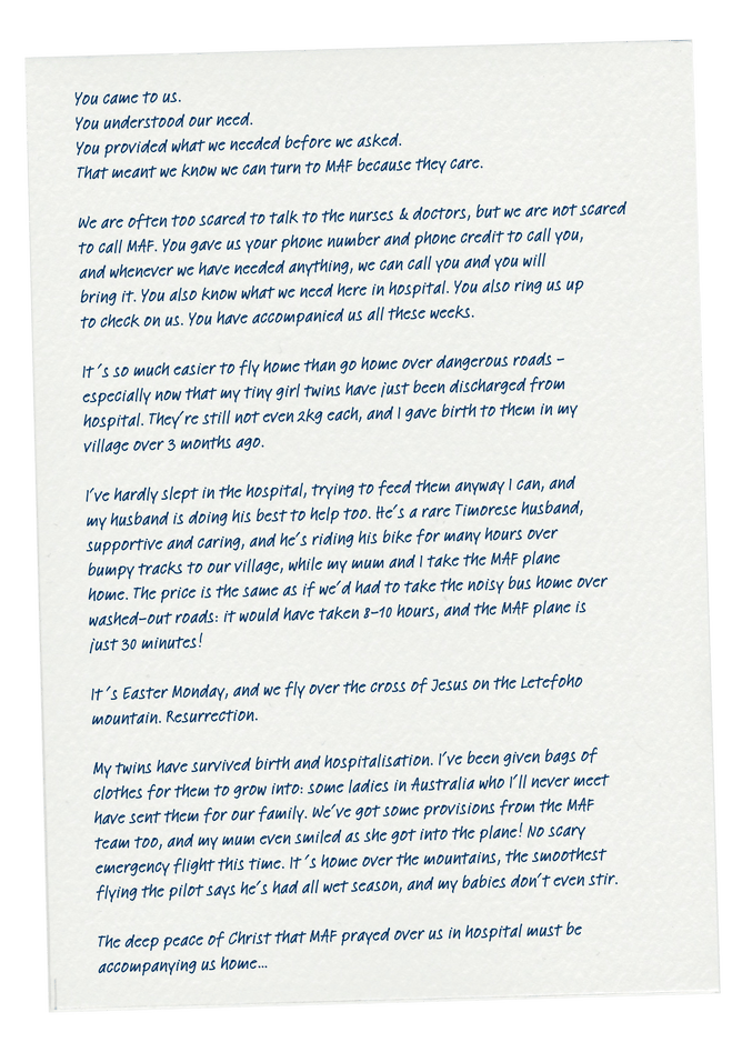 Ruth Hitchins writes from the perspective of a Timorese mother of twin girls who needed extra care in hospital. Her story shares how MAF is helping to care for patients beyond the plane.
