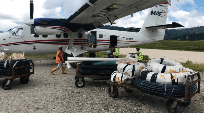 From the airstrip at Feranmin, all the materials still need to "walk" about 2 km, a task carried out by the people who live there. Many of the community helped with the unloading of the Twin Otter. Richie Axon, the Captain on this flight, observed that all the tools and other small materials, like cement bags, were loaded into bilums (strong and elastic hand woven string bags locally made of natural fibres). Larger items like the rolls of poly-pipe and sheets of form ply for concreting were carried by several men. Richie commented, “there are very few other aircraft that can match the Twin Otter to carry this load and land at an airstrip like this, flat and only 530m long, surrounded by bush. We really appreciate the generosity of the donors, who help keep our aircraft flying.“ With their giving we can cover the costs for fuel, maintenance, aviation insurance and other expenses for the aircraft to continue what we are here for: to bring life-changing help to isolated communities.